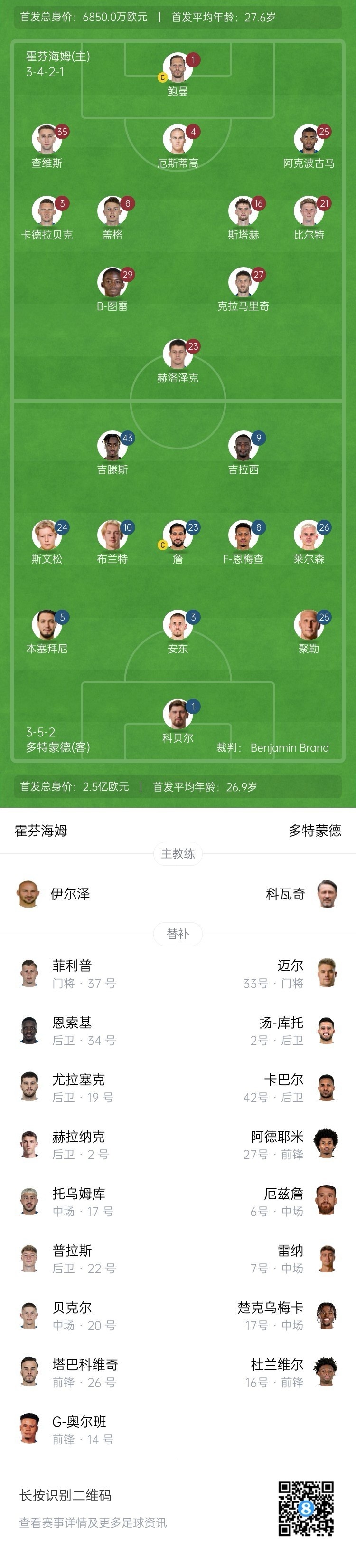 霍芬海姆首发:1-鲍曼、25-阿克波古马、4-厄斯蒂高、35-查维斯、21-比尔特、16-斯塔赫、8-盖格、3-卡德拉贝克、27-克拉马里奇、29-巴祖马纳-图雷、23-赫洛泽克